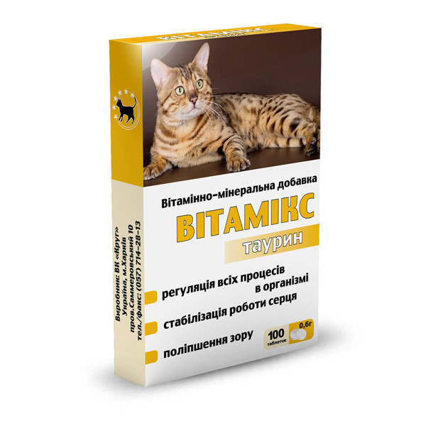 Таурин, який входить до складу «, Вітамікс», необхідний для стабілізації роботи серця й печінки. «, Вітамікс Таурин», покращує стан сітківки очей, підтримує серцеву діяльність, а також тонізує роботу нервової, дихальної та репродуктивної системи.