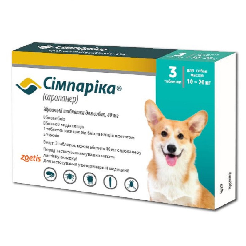 Таблетки для собак 10-20 кг Симпарика 40 мг інсектоакарицидний засіб No3 Zoetis